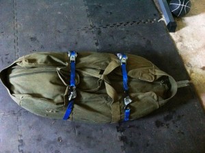 So I decided to modify an old sandbag. I combined the sand from a lighter bag to make this one extra heavy. With the extra weight, there’s no way I could grip the sides of the bag to lift it. That’s why I used some ratcheting straps for handles and because the ones sewn on would easily rip off. I also duct taped the hooks to keep them from opening up while raising or lowering the bag.
