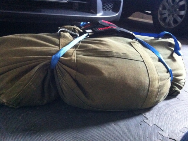 I originally did more traditional deadlifts while pulling just the straps, lifting the bag lengthwise. (See my original post.). But I find I can lift more weight with better technique using the sumo deadlift and this new setup. It puts less stress on my back, the bag doesn’t wack me in the knees, and I can work my traps a little better too. All you have to do is stand over the bag, grab the handles, look up, keep your back straight, and pull!