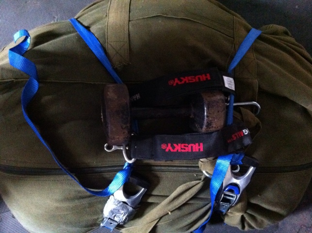 You can see in the picture I left some space to slide extra weight beneath the grips I fashioned. Be careful not to leave too much room: if there’s too much slack it’s hard to lift the bag. You can also put a big dumbbell on top of the strap and between the handles without much difficulty. The heavy weight won’t fall off even if you jack the straps as hard as you can.