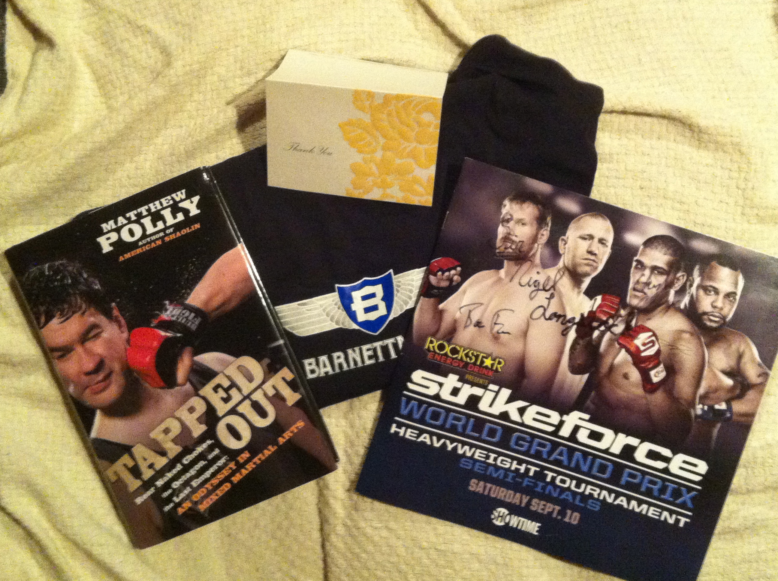 It is an amazing piece of artistry, I know. I thought a mention on my favorite podcast would be reward enough, but then Ben and Chad declared that they would be sending random assortments of MMA related crap to all those that were mentioned on the show. I was elated. On Monday, I received my random assortment. I knew to expect a Josh Barnett T-shirt, but also included were a book by Matthew Polly and a program from the Strikeforce Heavyweight GP (autographed by Ben, Chad, and resident #CME theatricalist Sir Nigel Longstock). My favorite inclusion in the package though, was a touching note from Chad and Ben. Within the lovely ‘Thank You’ card was a message that only fans of the CME Podcast would take as a term of serious endearment. The guys clearly appreciated my work…